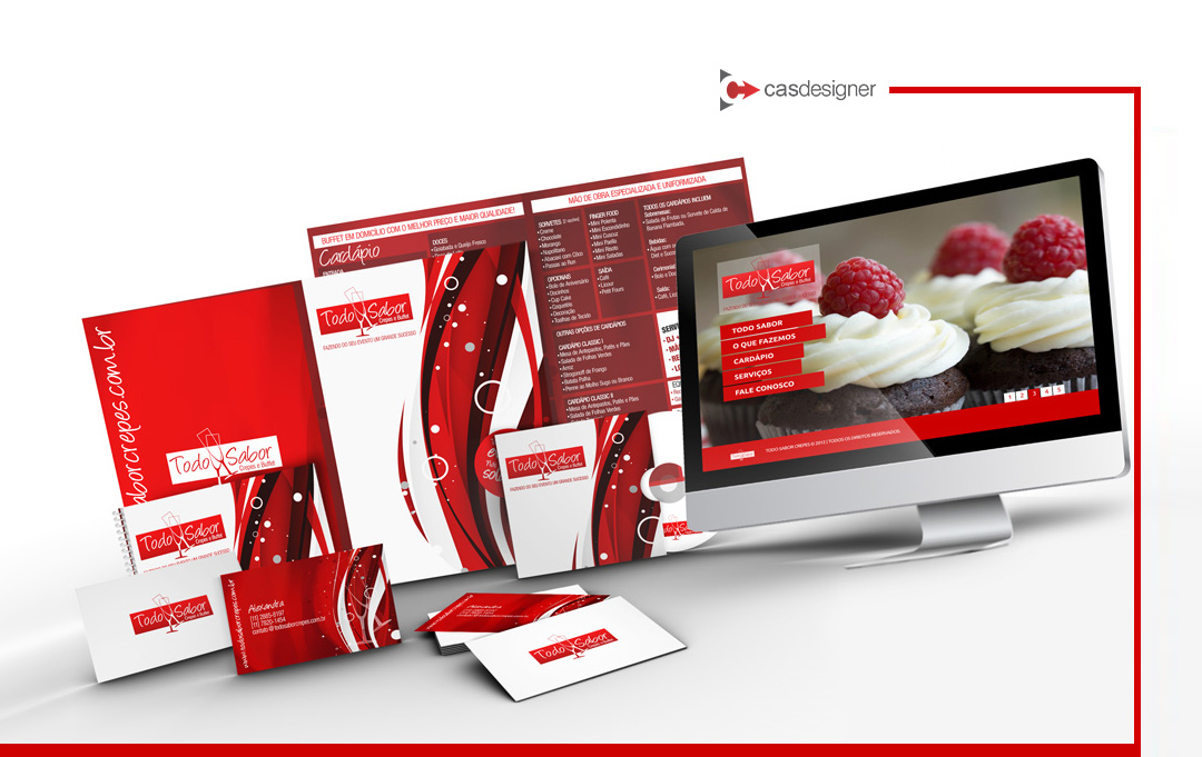 Cartões + Convites + Sites + Mídias Sociais + Cardápio + Jogo Americano + Flyers + Banners + Faixas + Sinalização